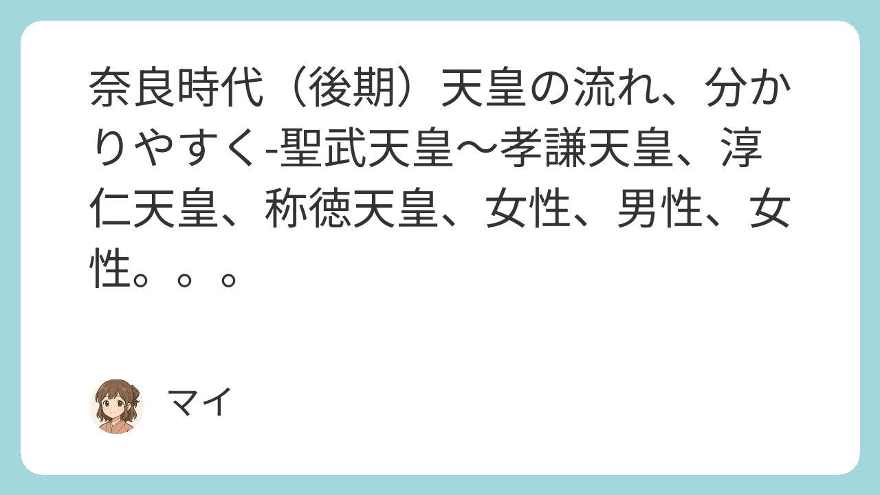 | 孝謙天皇 | 749〜758年 | 聖武×光明の娘。初の女性皇太子 → 女性天皇 |
